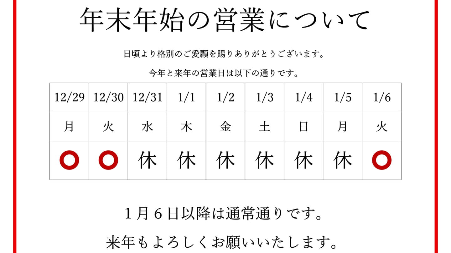 | 12月24日 | 年末は12/30まで、年始は1/6より営業いたします |